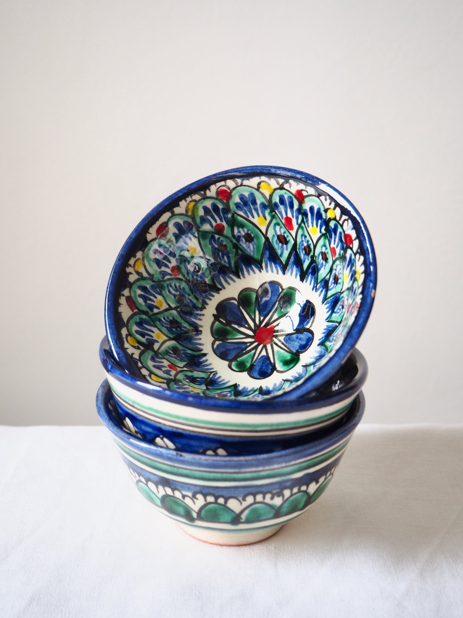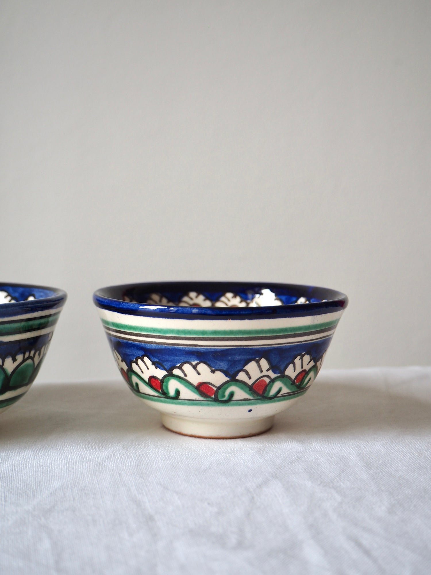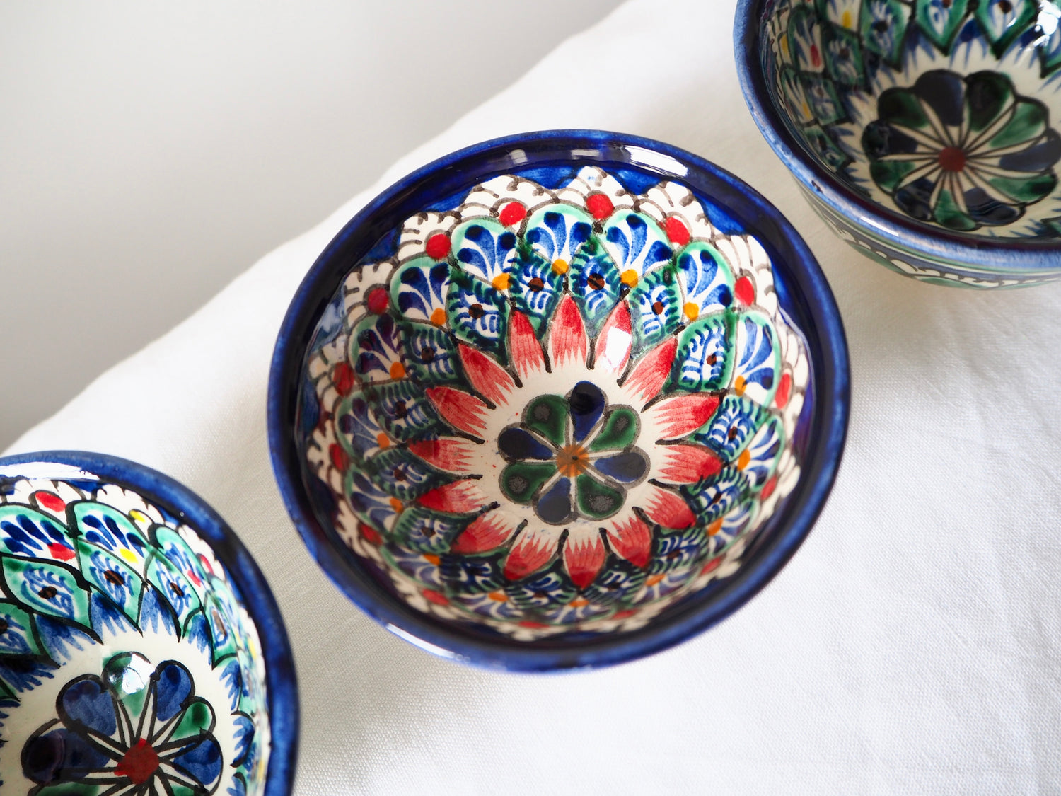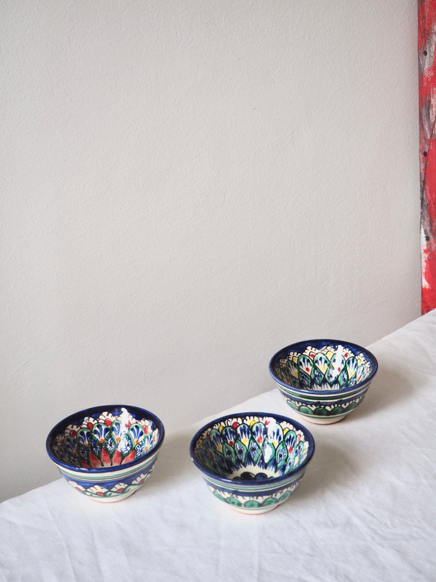 Ensemble de trois petites tasses à café ou coupelle à sauce en céramique de Richtan, artisanat traditionnel d'Ouzbékistan.