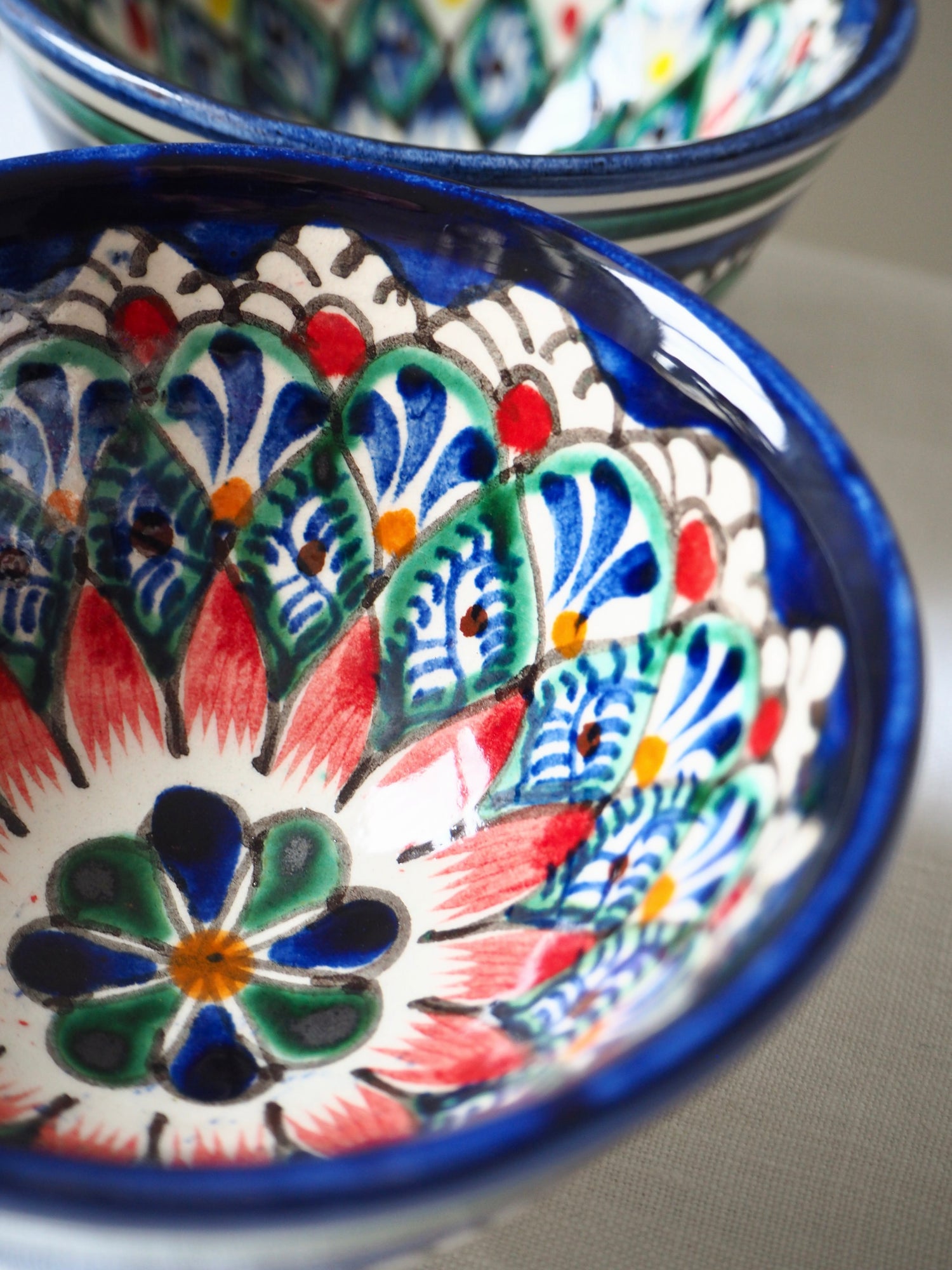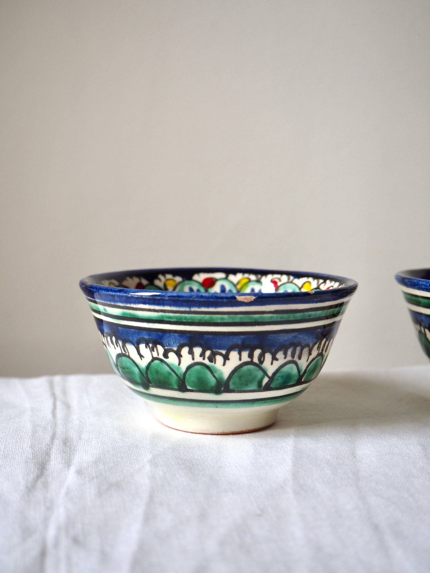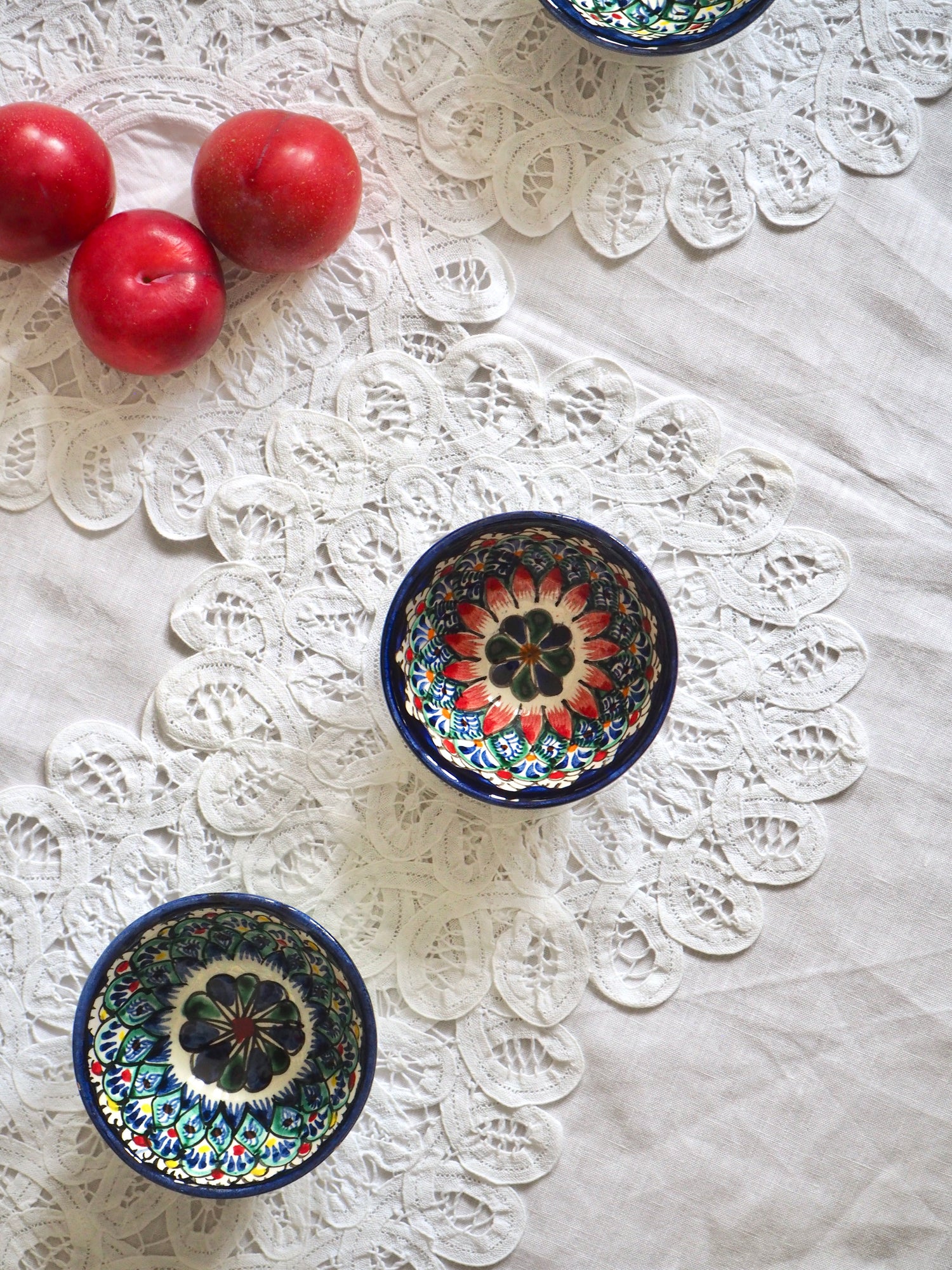 Ensemble de trois petites tasses à café ou coupelle à sauce en céramique de Richtan, artisanat traditionnel d'Ouzbékistan.