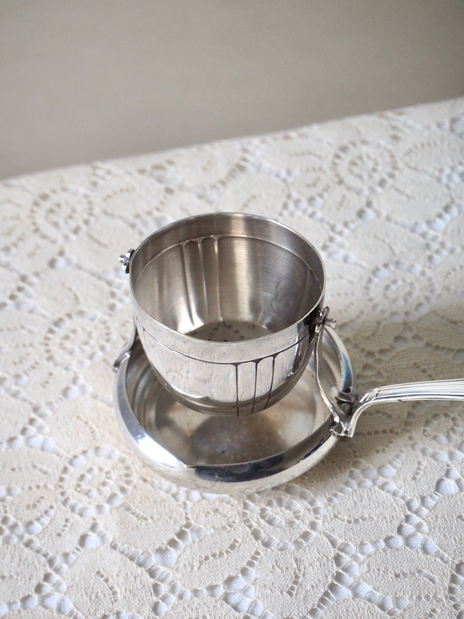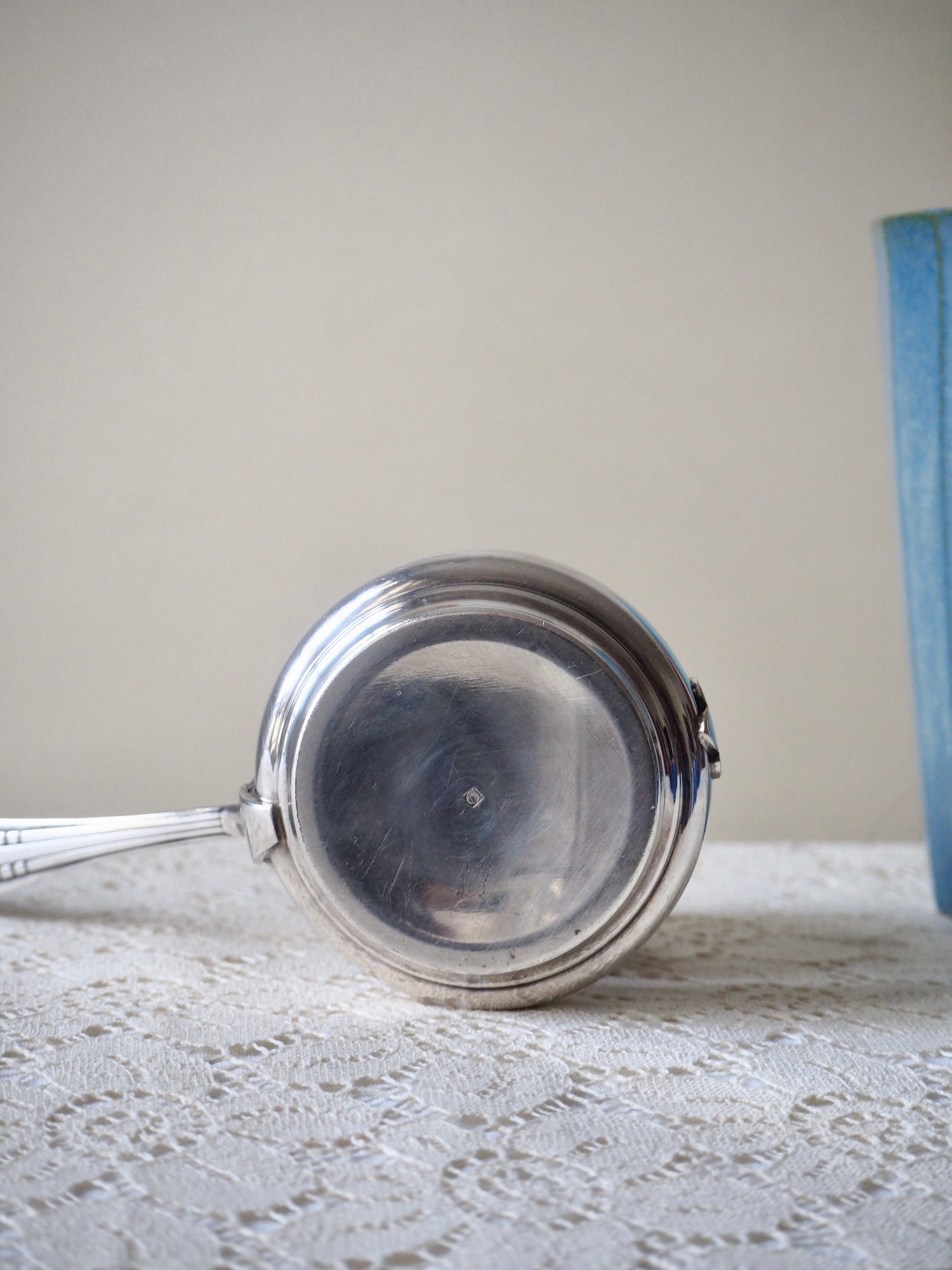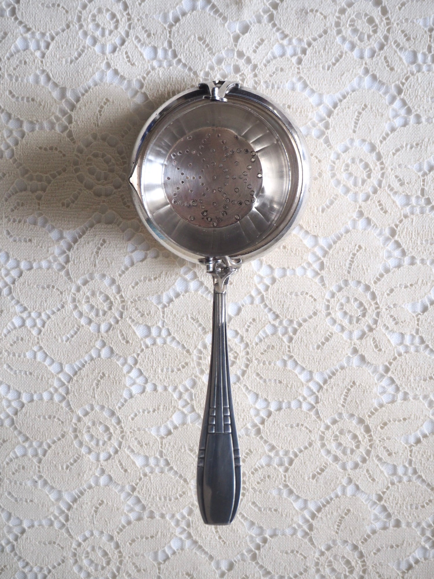 Elégante passoire à thé ancienne en métal argenté avec poinçon sur le couvercle non identifié.
