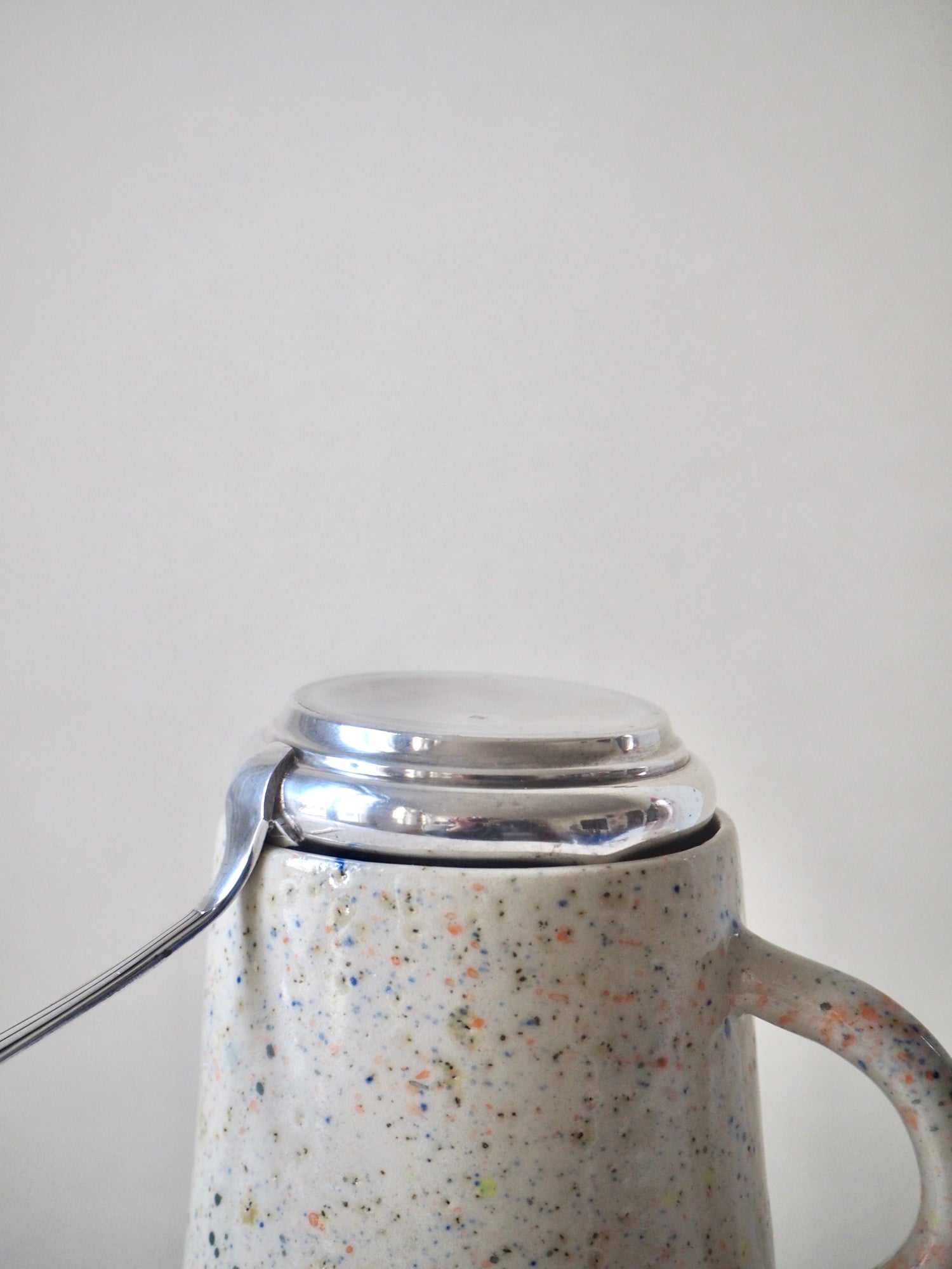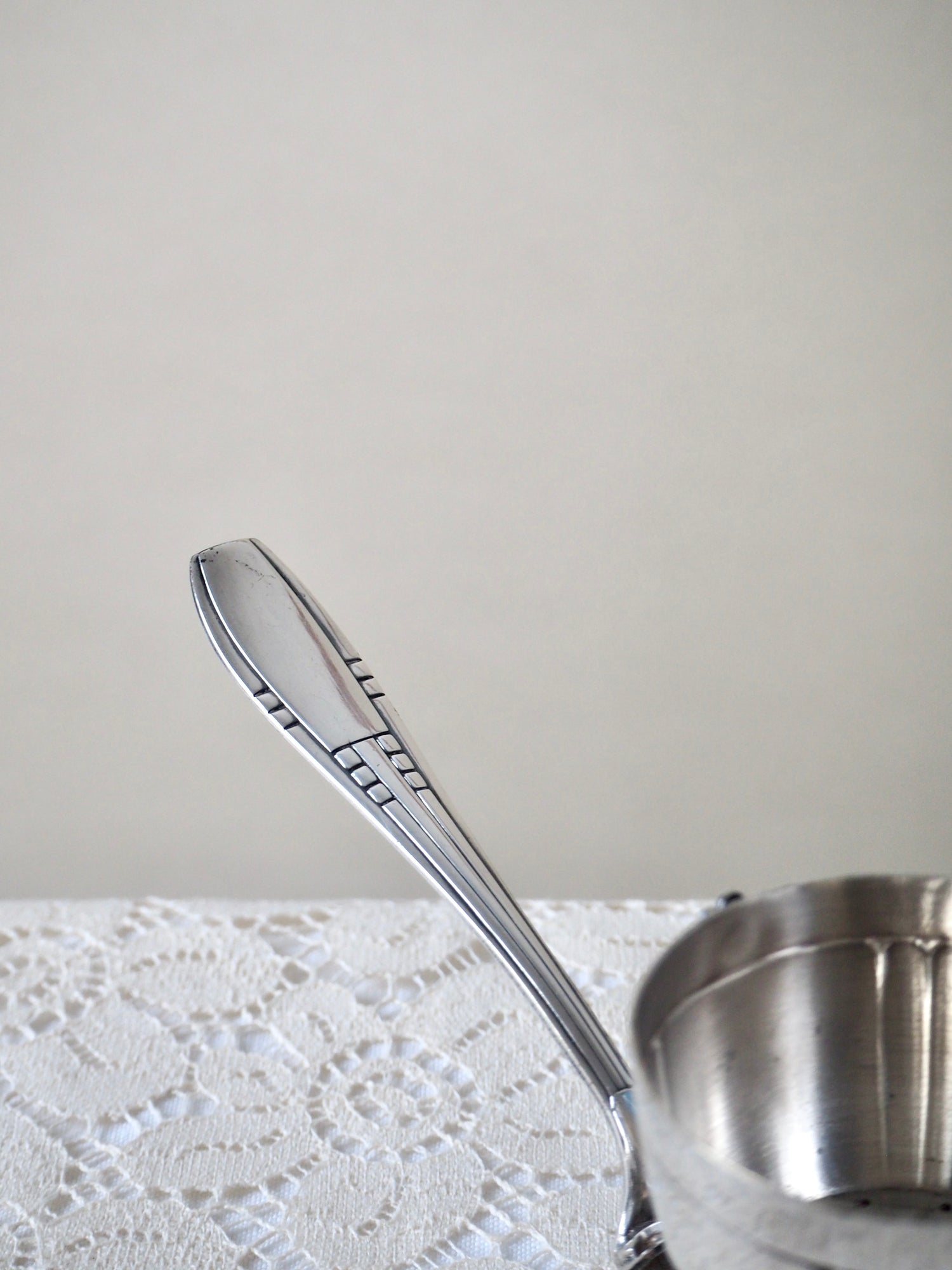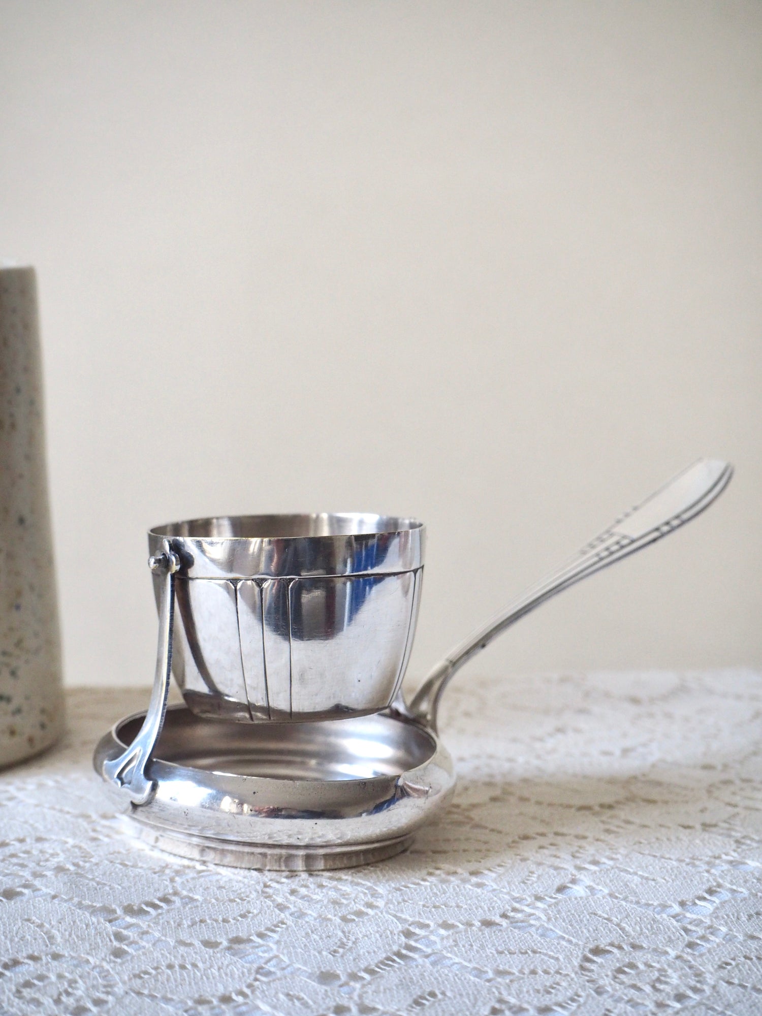 Elégante passoire à thé ancienne en métal argenté avec poinçon sur le couvercle non identifié.