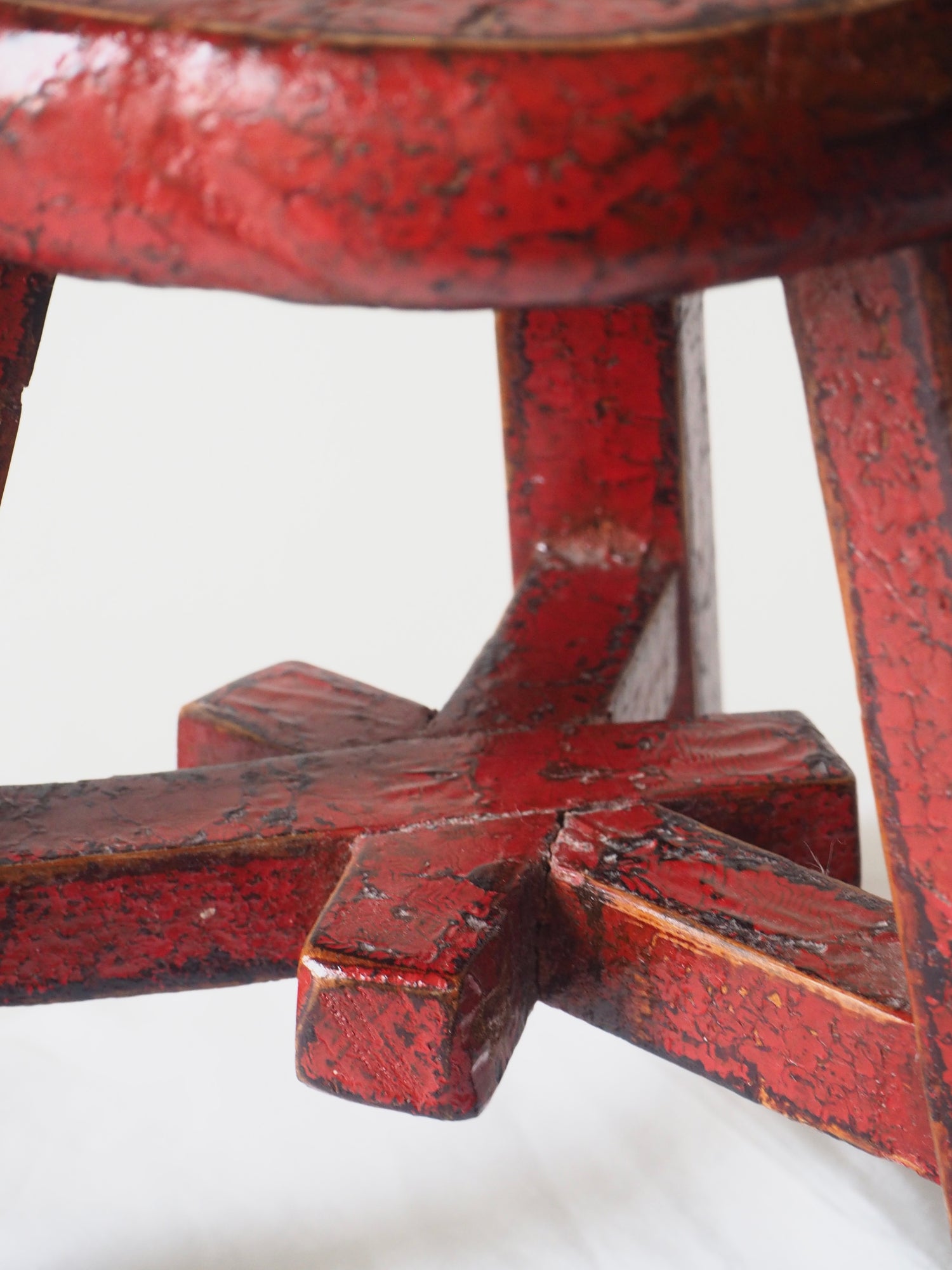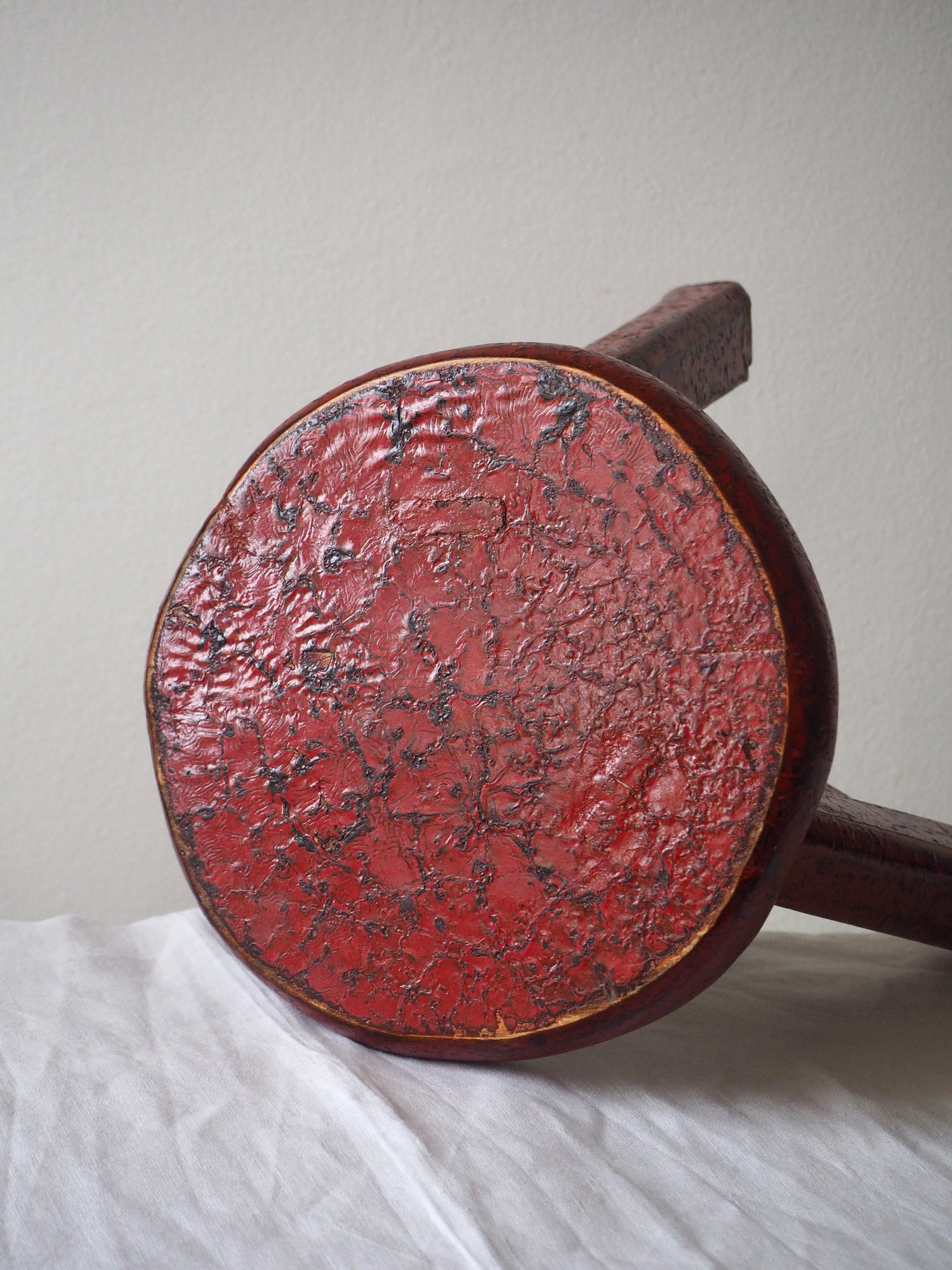 Petit tabouret en bois tripode, coloris rouge avec effet craquelé. Objet artisanal de style asiatique.