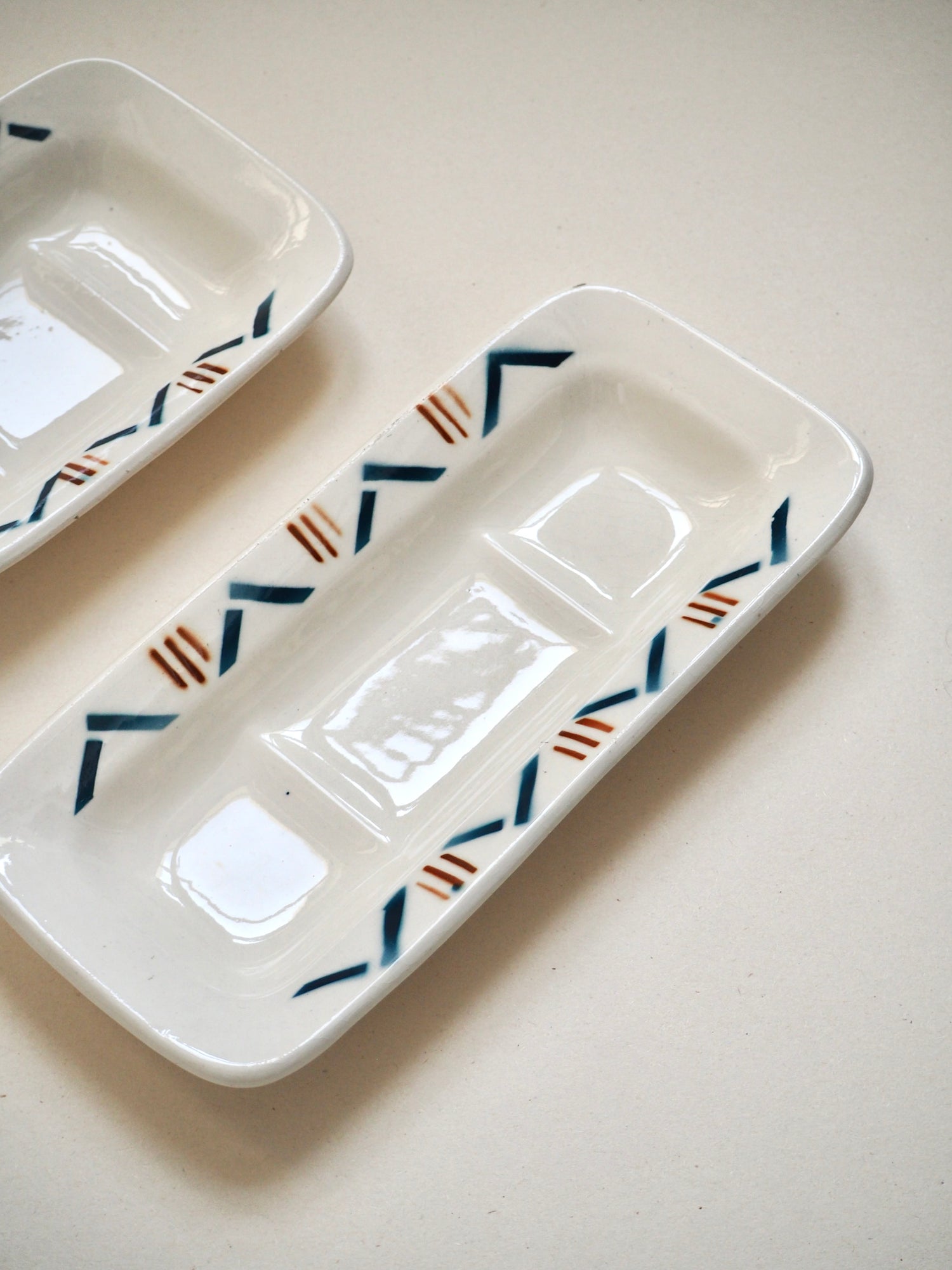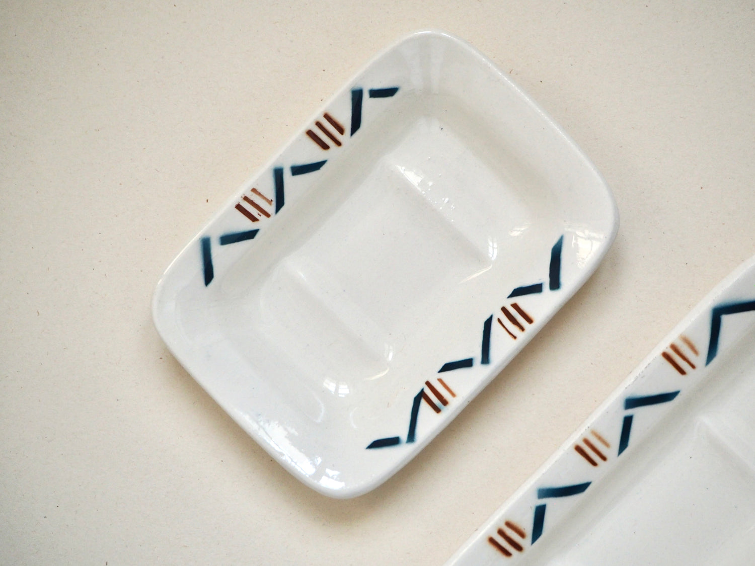 Ensemble porte-savon et porte de peigne en faïence ancienne, décorées de motifs géométriques, style art déco