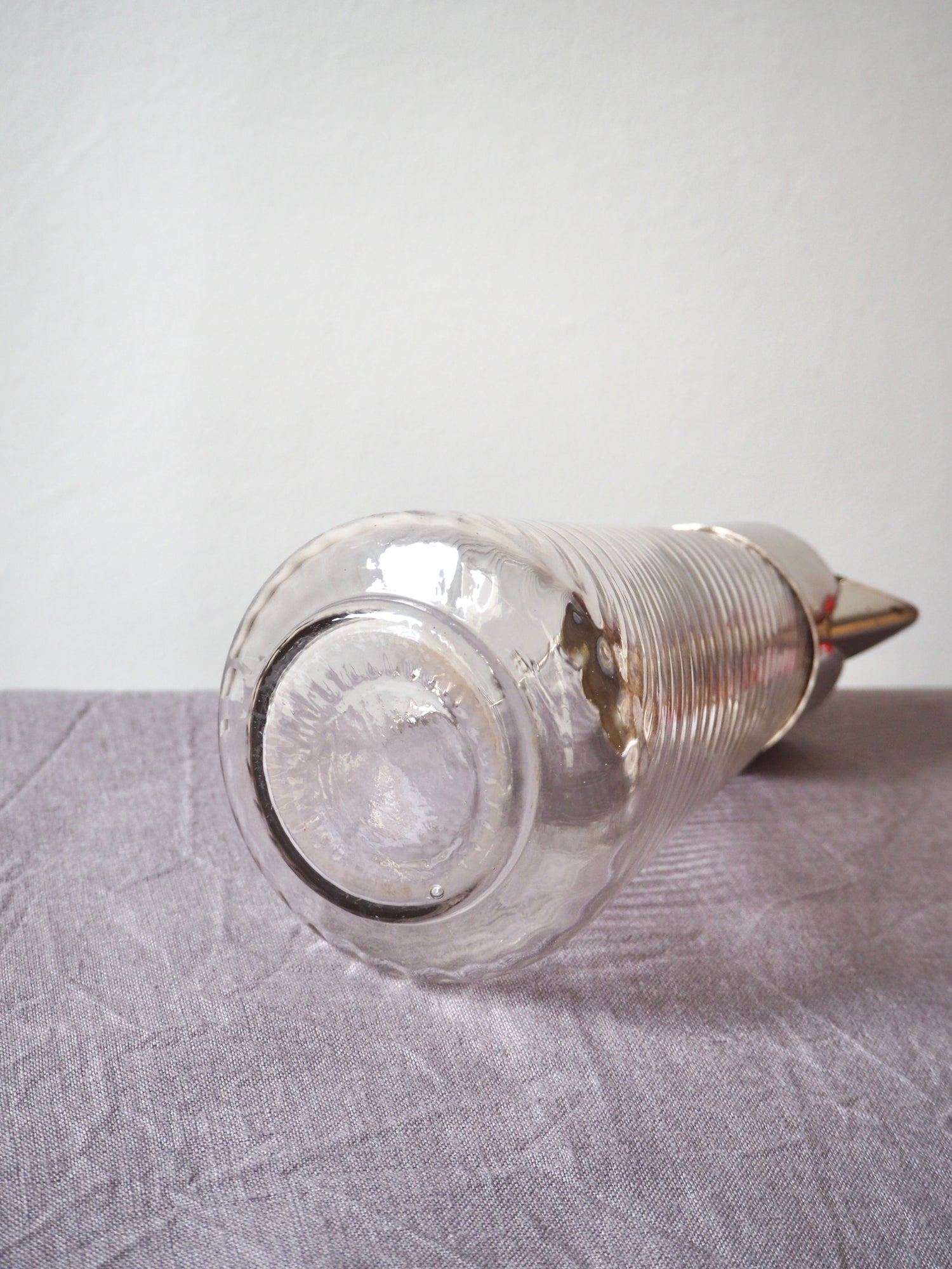 Elégante aiguière ou carafe ancienne en verre soufflé et laiton.