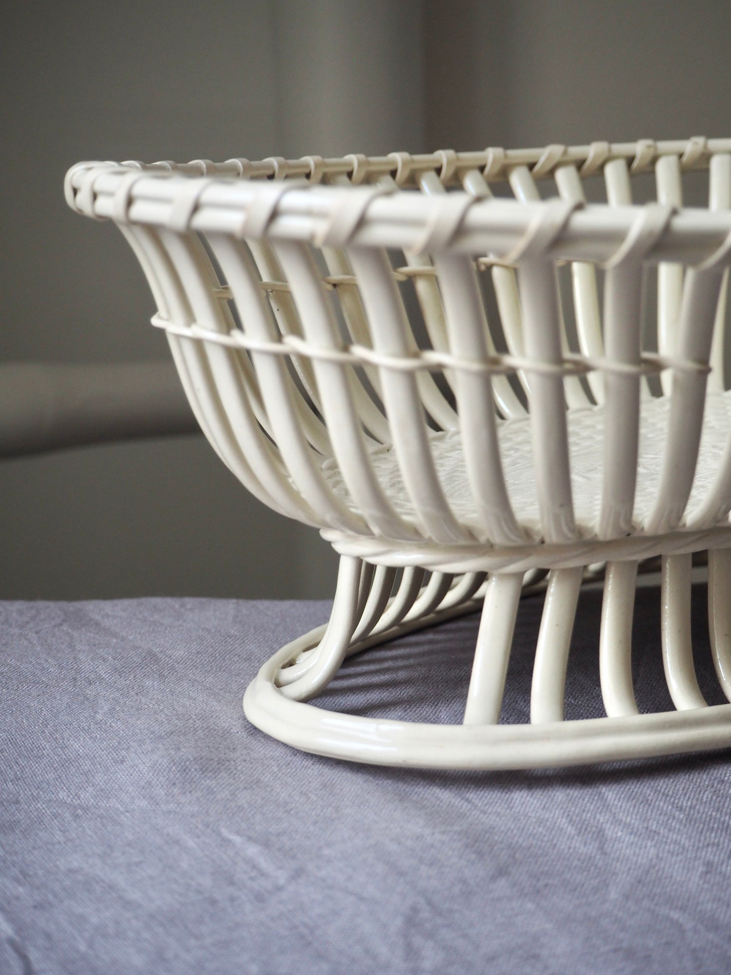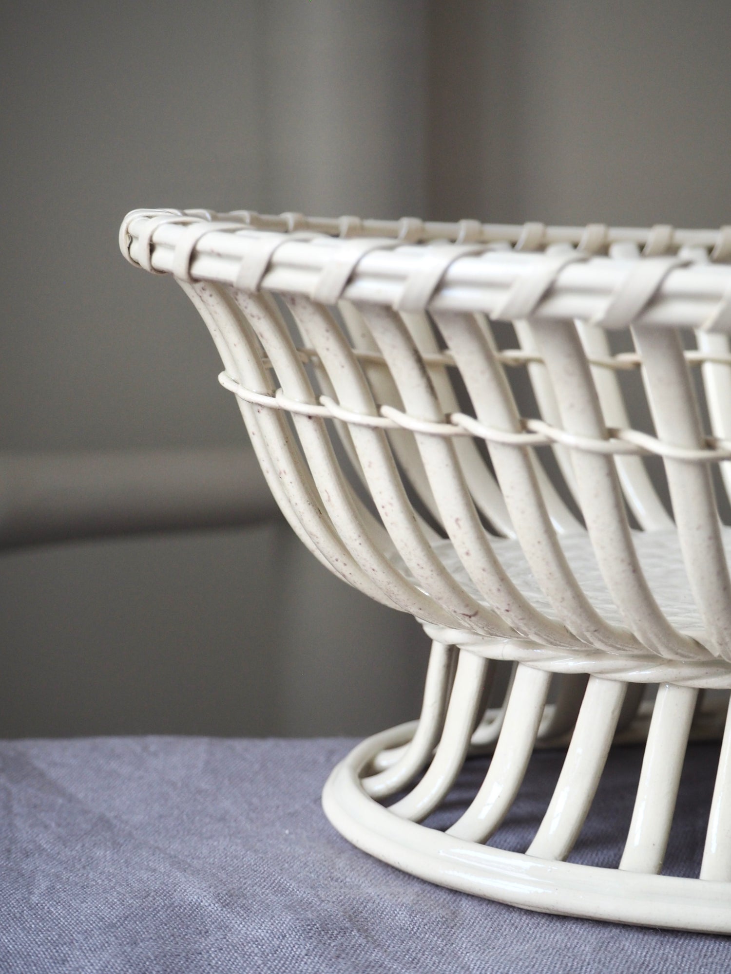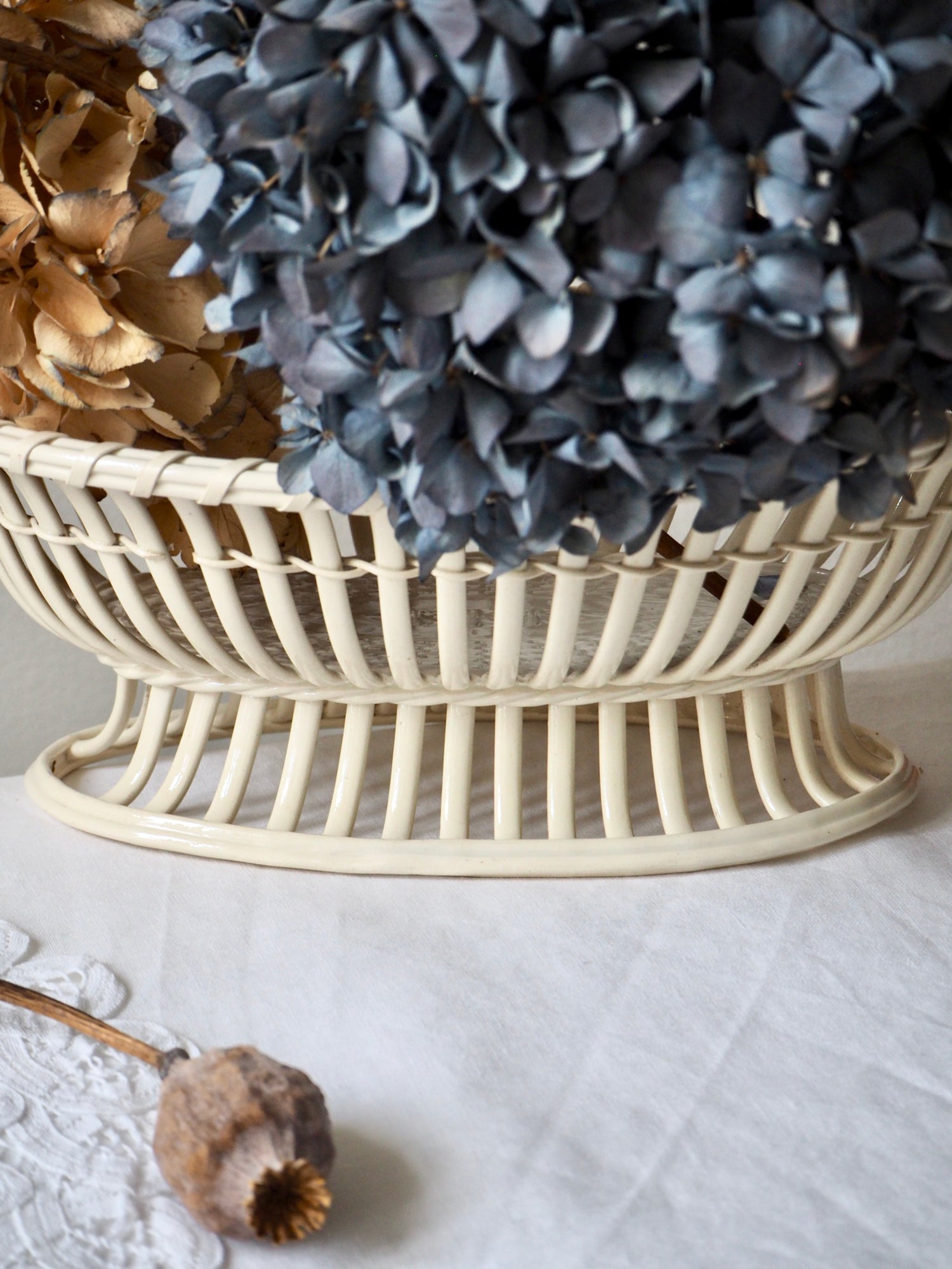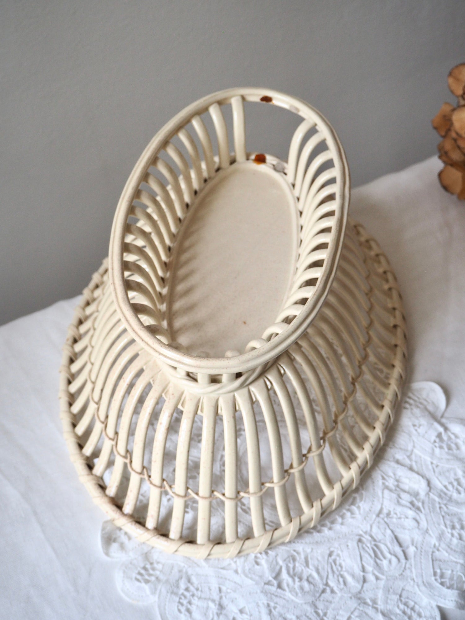 Corbeille ancienne sur pied en métal tressé ajouré. Coloris écru.