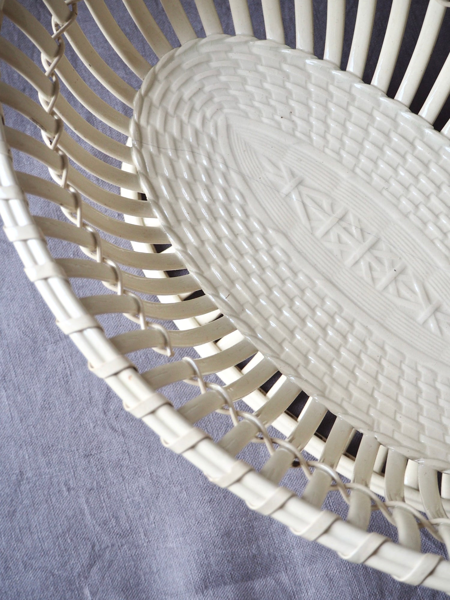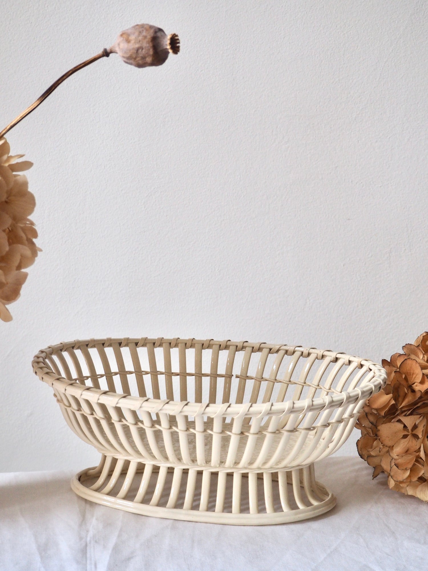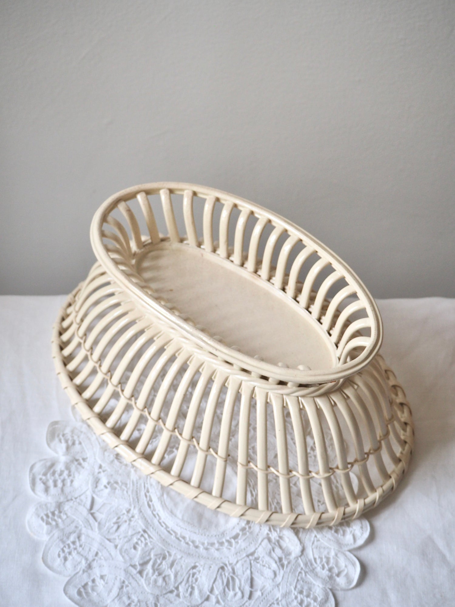 Corbeille ancienne sur pied en métal tressé ajouré. Coloris écru.