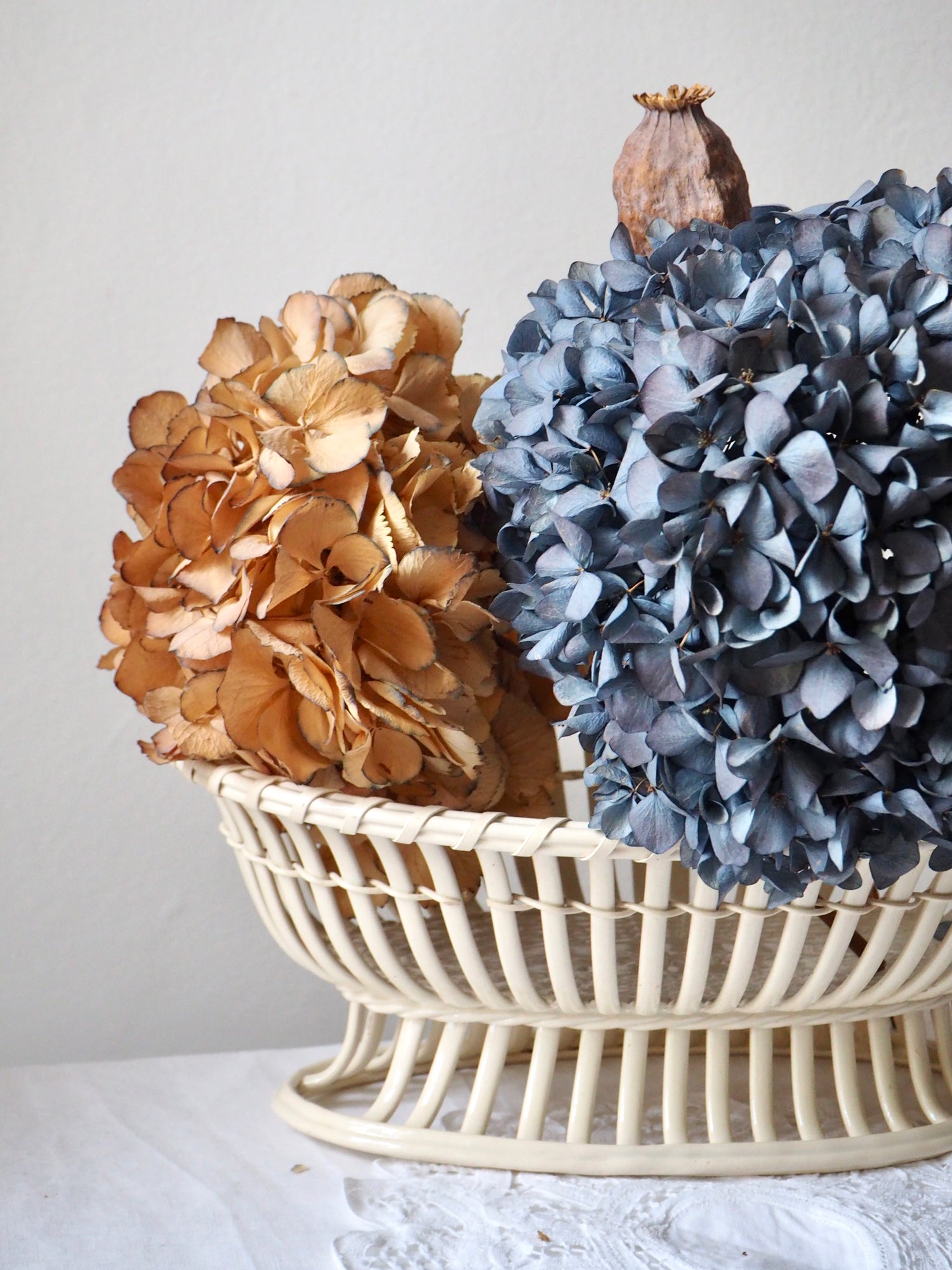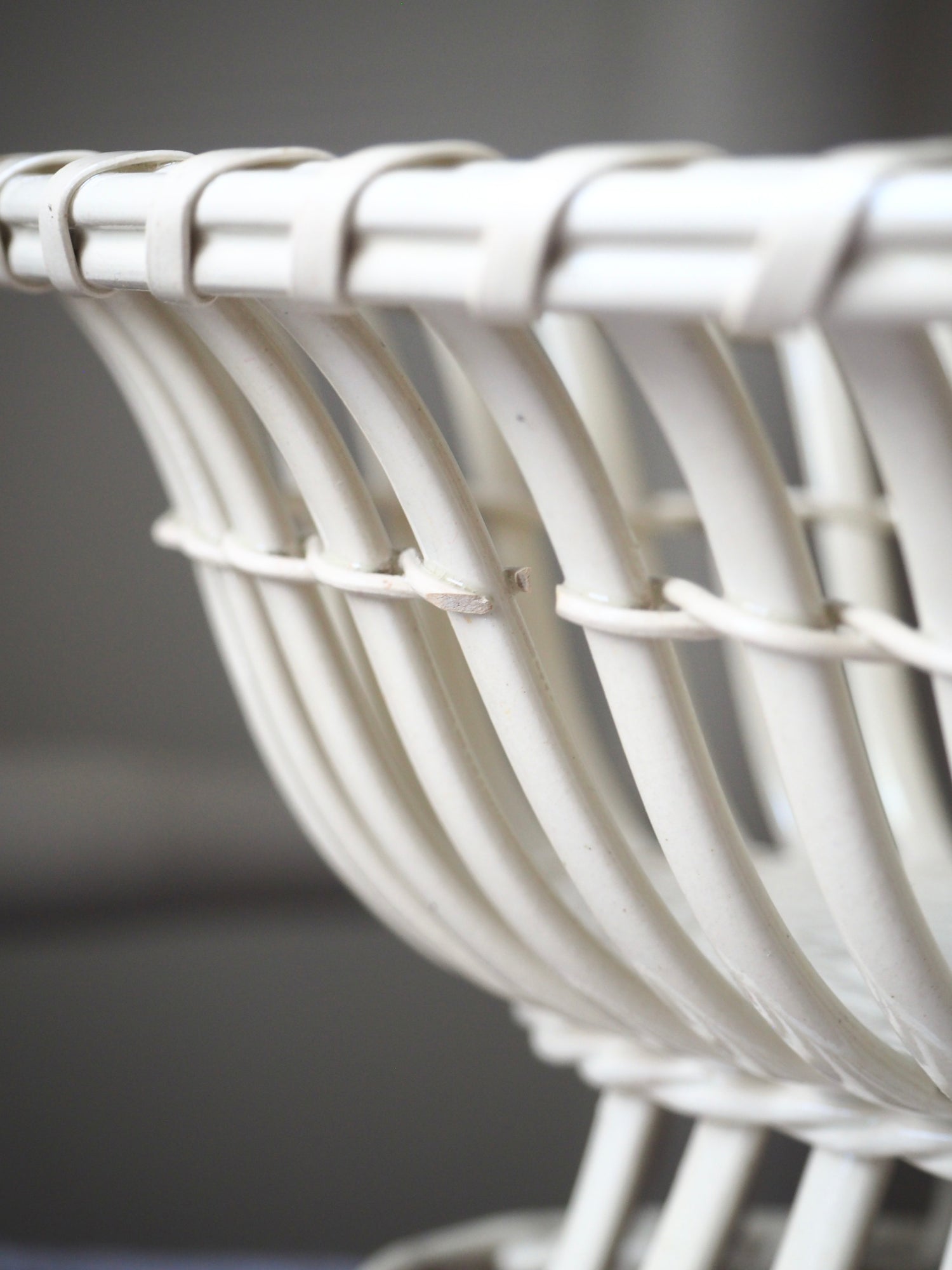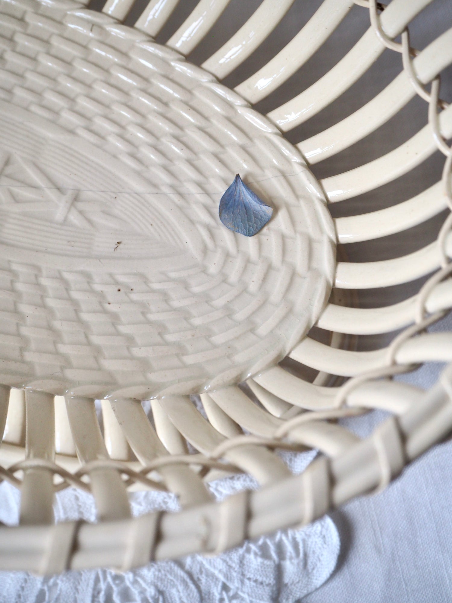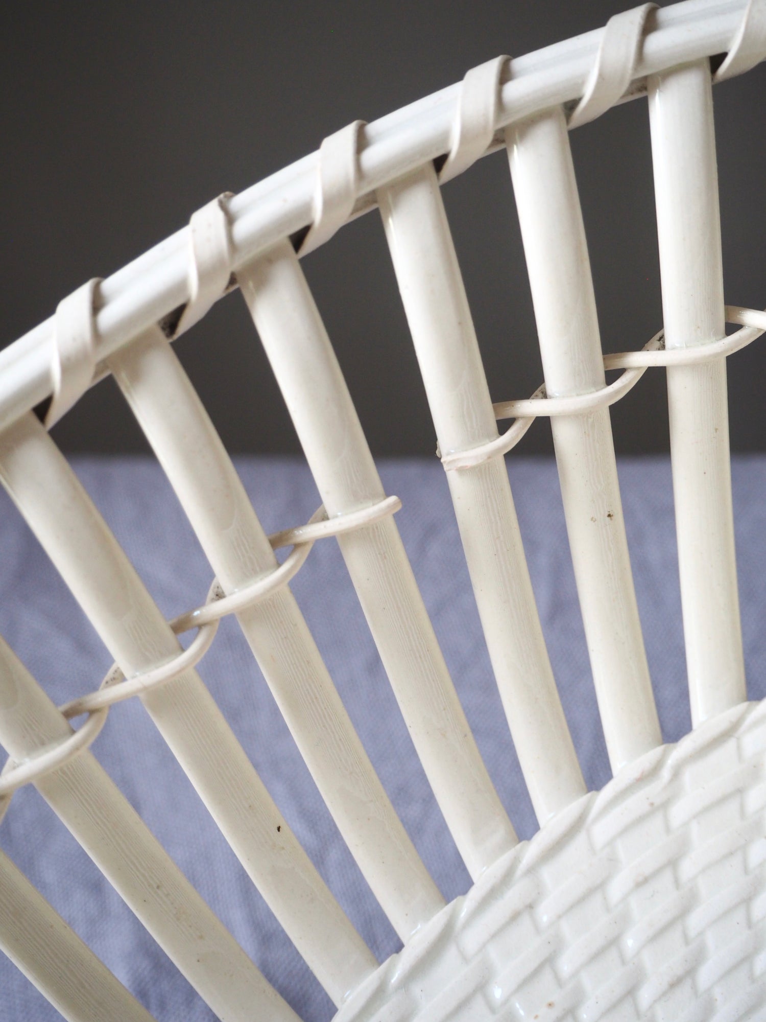 Corbeille ancienne sur pied en métal tressé ajouré. Coloris écru.