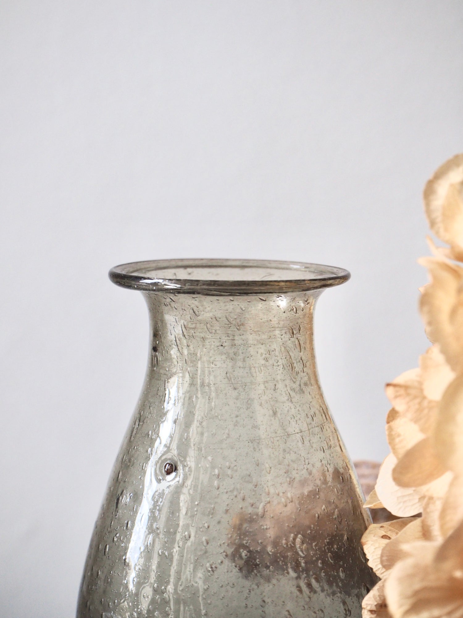 Joli petit vase en verre soufflé et bullé coloris gris taupe.