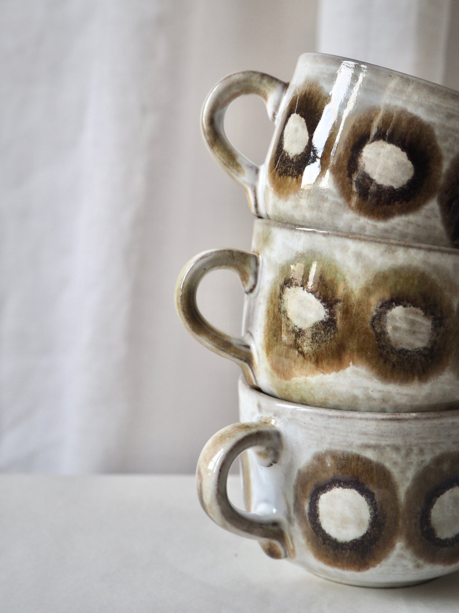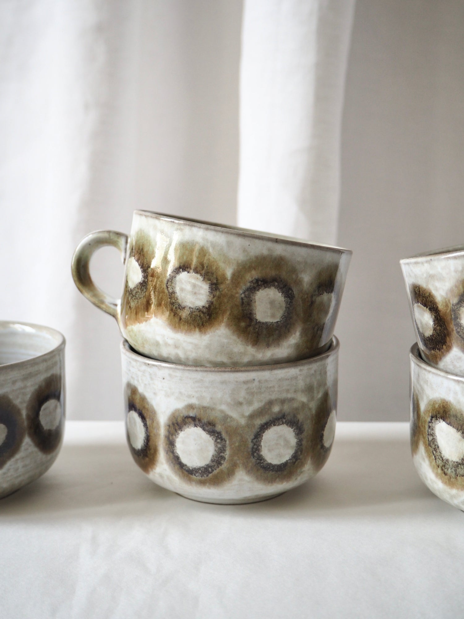 Ensemble de cinq tasses à café avec leurs sous-tasses en céramique signées de la manufacture allemande Ceramano Steinzeug, West Germany. Modèle "Tique" dessiné par Gerda Heuckeroth, autour des années 70.