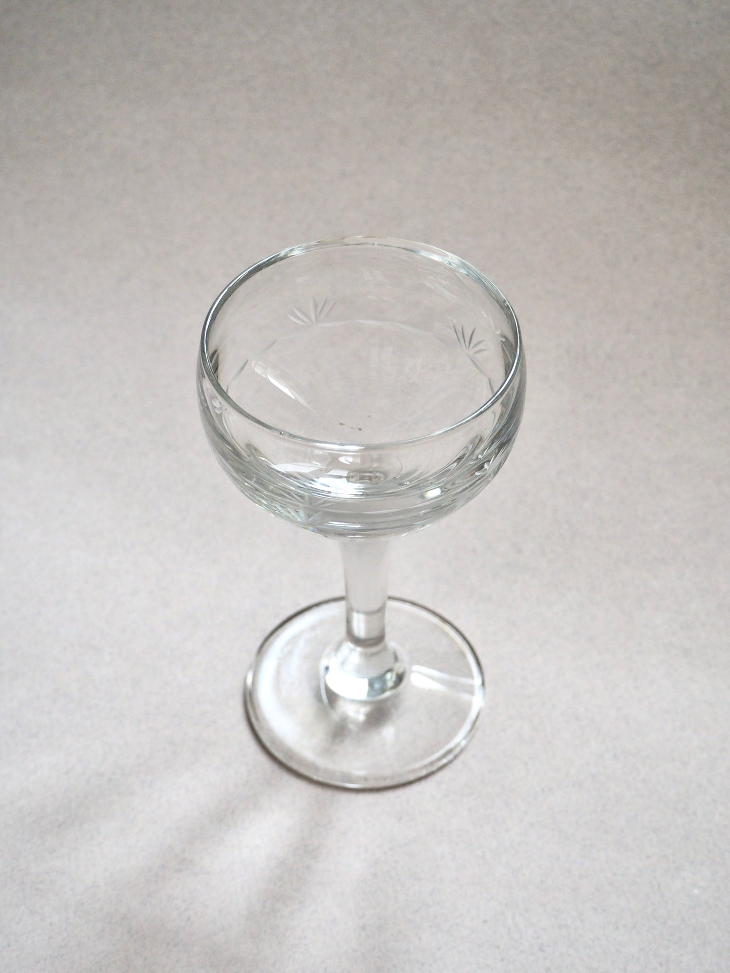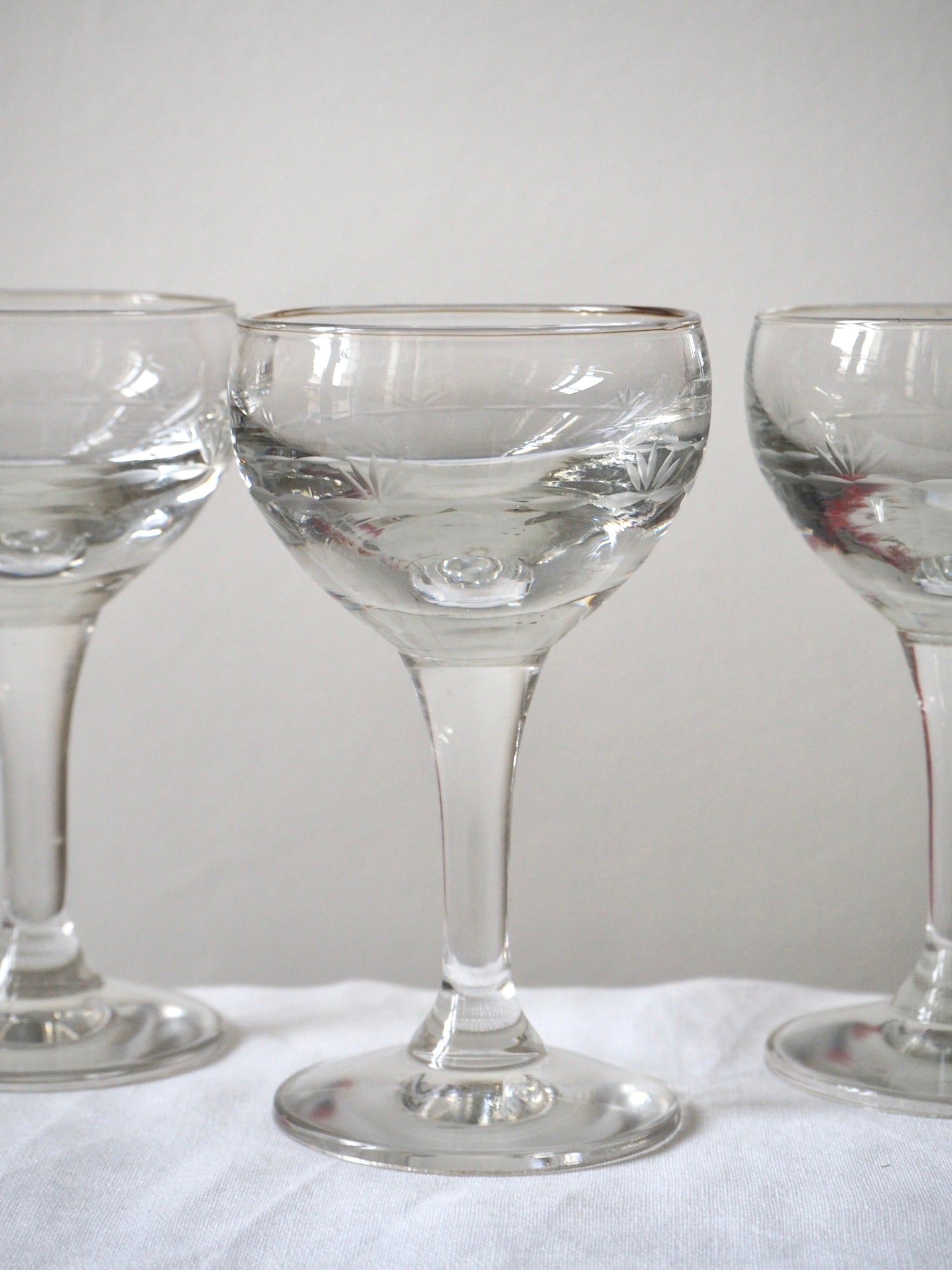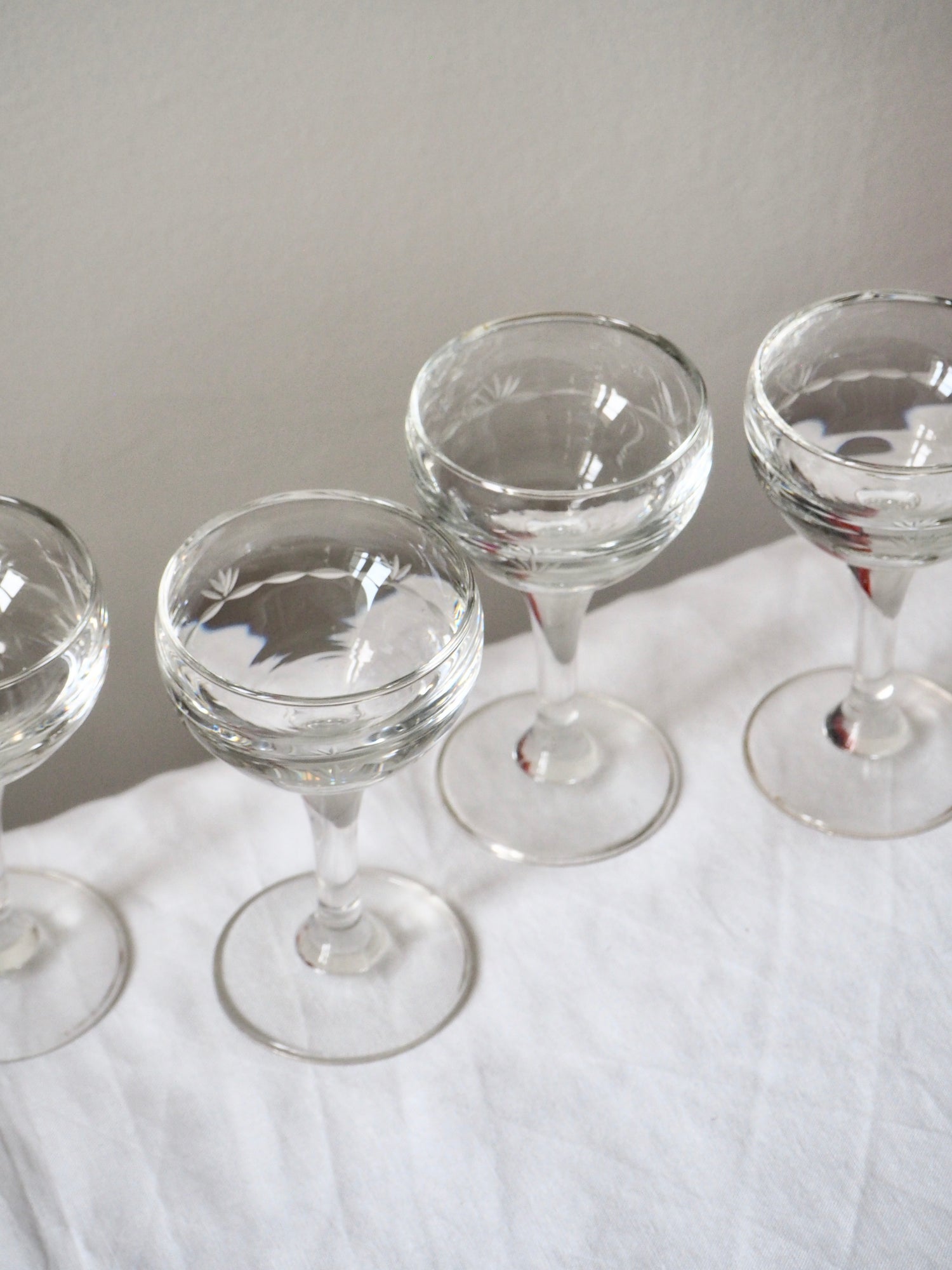 Ensemble de quatre verres à pied en verre moulé et ciselé, idéals pour l'apéritif ou le vin blanc. Verre épais et de belle qualité.
