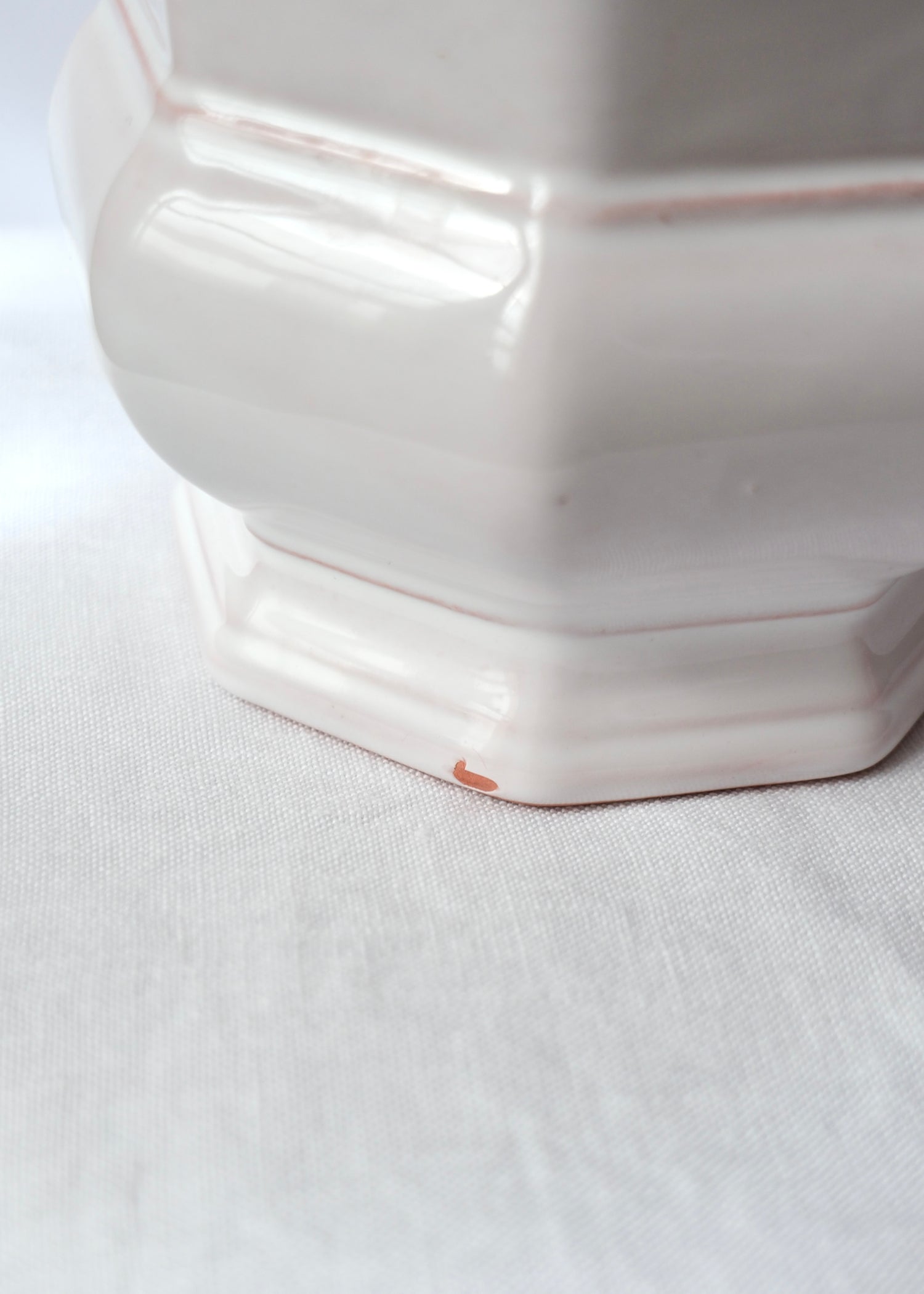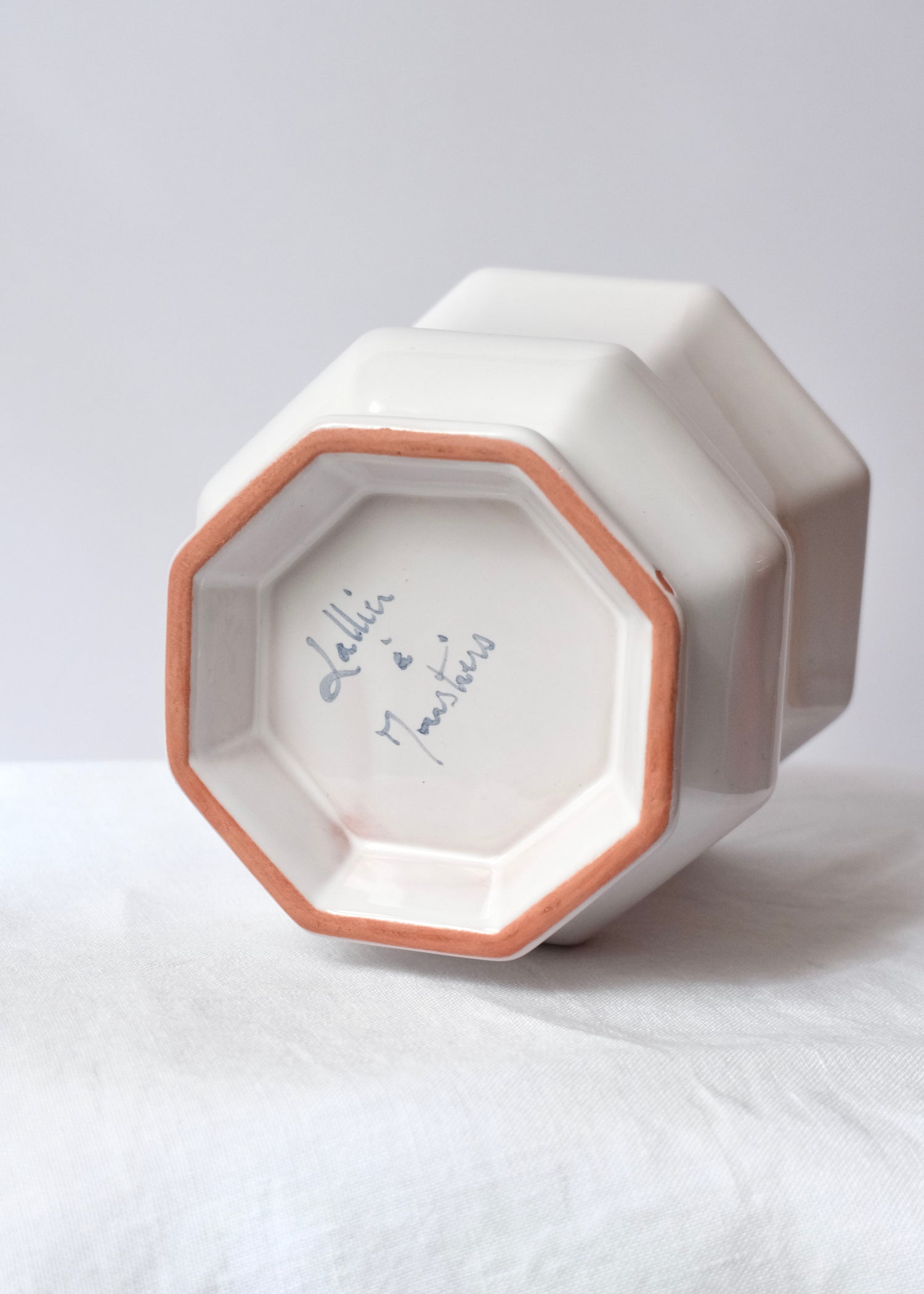 Vase ou cache-pot, à vous de voir ! Emaillé blanc et forme octogonale, céramique en très bon état signée Lallier à Moustiers.